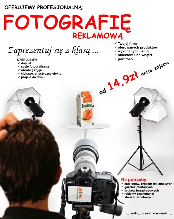 Oferujemy wykonanie profesjonalnej sesji zdjęciowej Państwa firmy, wykonywanych usług, pracy linii produkcyjnej, oferowanych produktów i wszelkich zdjęć wedle Państwa potrzeb.